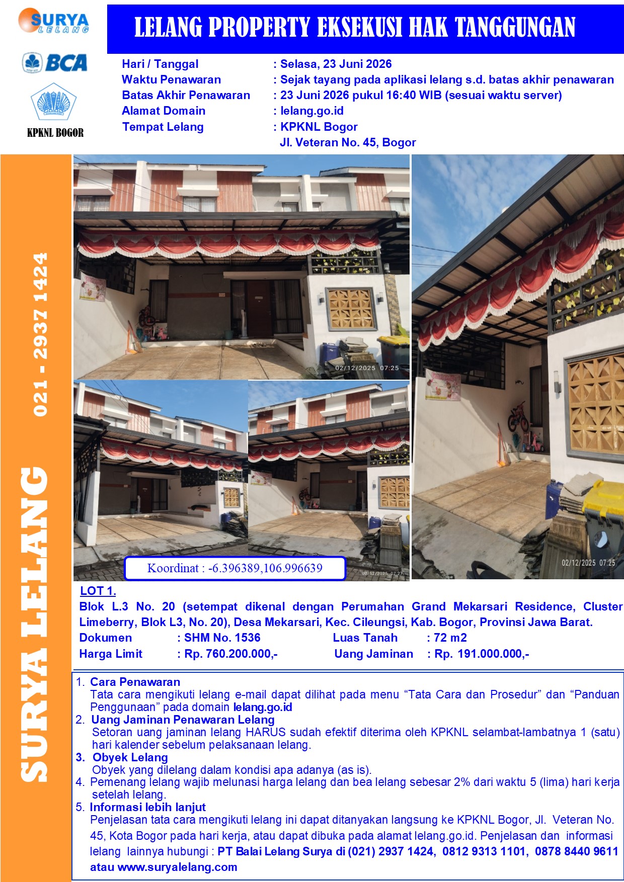 Sebidang tanah seluas 72 m2 berikut bangunan sesuai SHM No. 1536, terletak di Blok L.3 No. 20 (setempat dikenal dengan Perumahan Grand Mekarsari Residence, Cluster Limeberry, Blok L3, No. 20), Desa (dh. Desa/Kelurahan) Mekarsari, Kecamatan Cileungsi, Kabupaten (dh. Kabupaten/Kota) Bogor, Provinsi Jawa Barat